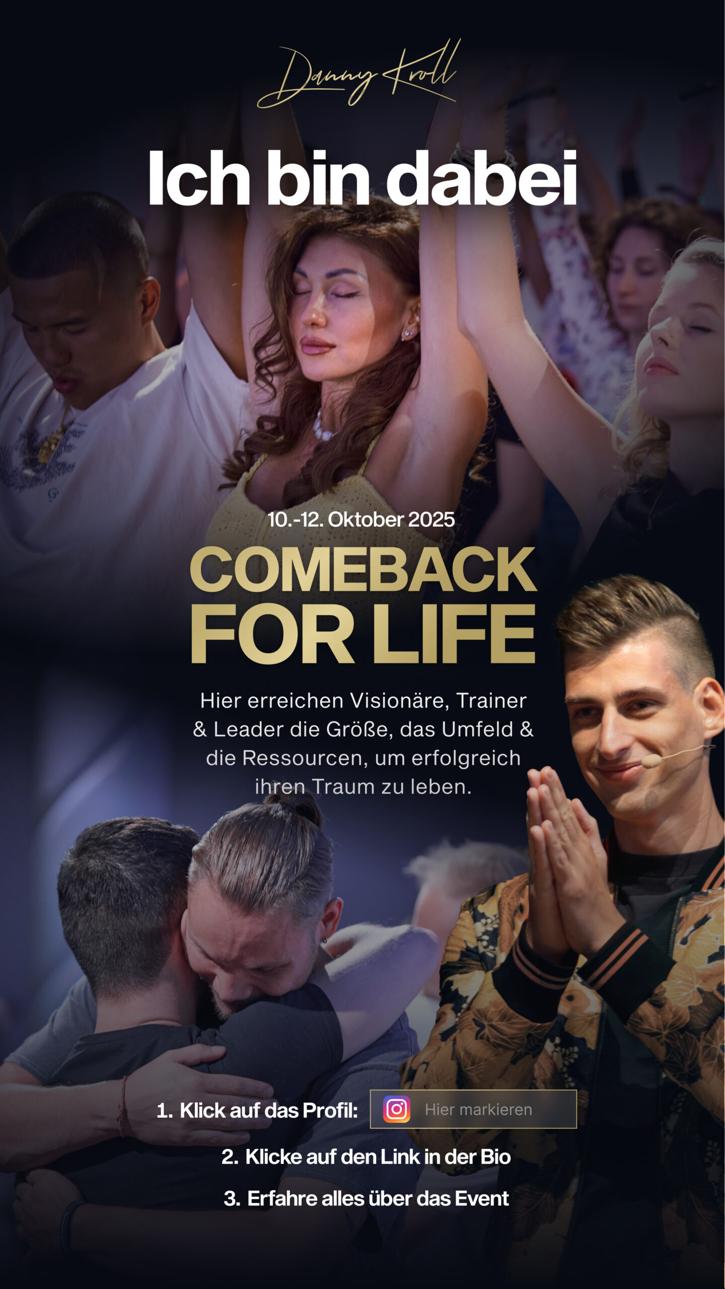 Wir wollen mit dem Comeback For Life Event möglichst viele Menschen erreichen – dabei kannst du helfen! Lade dir die Story Vorlage herunter, teile unsere Vision auf Instagram, markiere @danny.kroll_new und werde Teil dieser Bewegung. Unter allen, die mitmachen, verlosen wir einen Platz für unser nächstes Retreat.