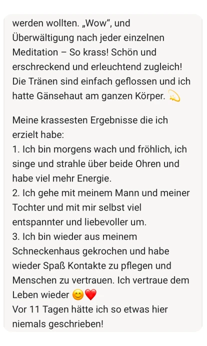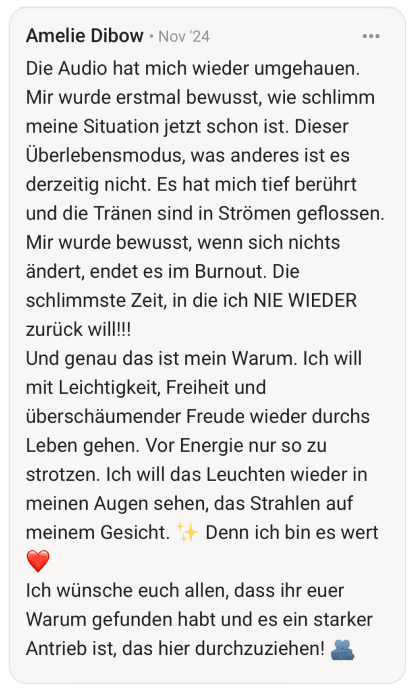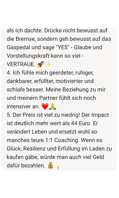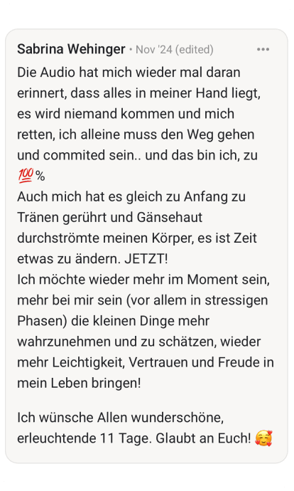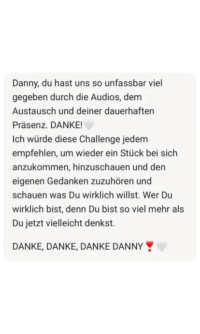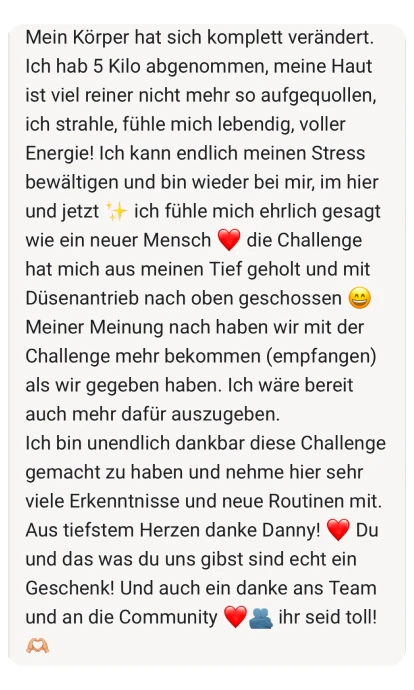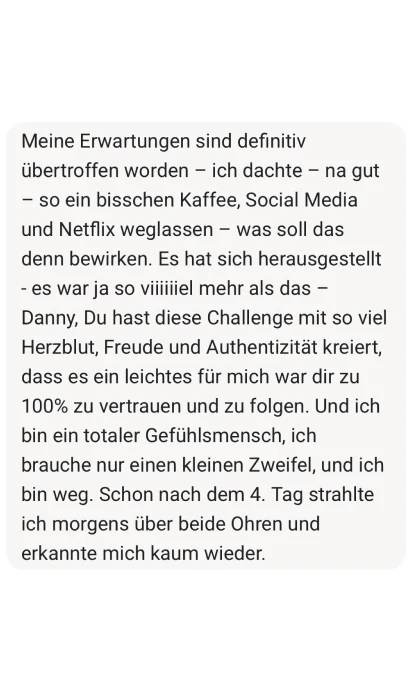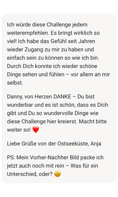 Ich habe diese Challenge für dich kreiert, weil ich selbst durch die Hölle gegangen bin. Weil ich weiß, wie es sich anfühlt, äußerlich zu glänzen und innerlich zu zerbrechen. Und weil ich auf der anderen Seite wieder rausgekommen bin.